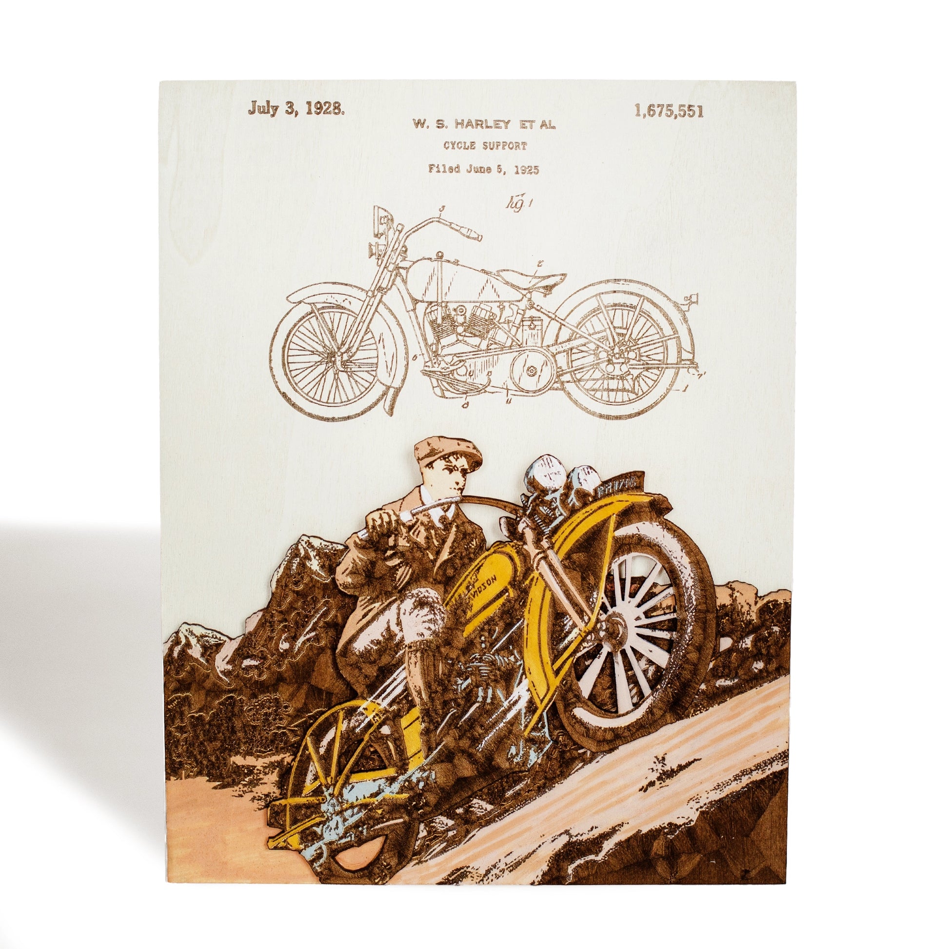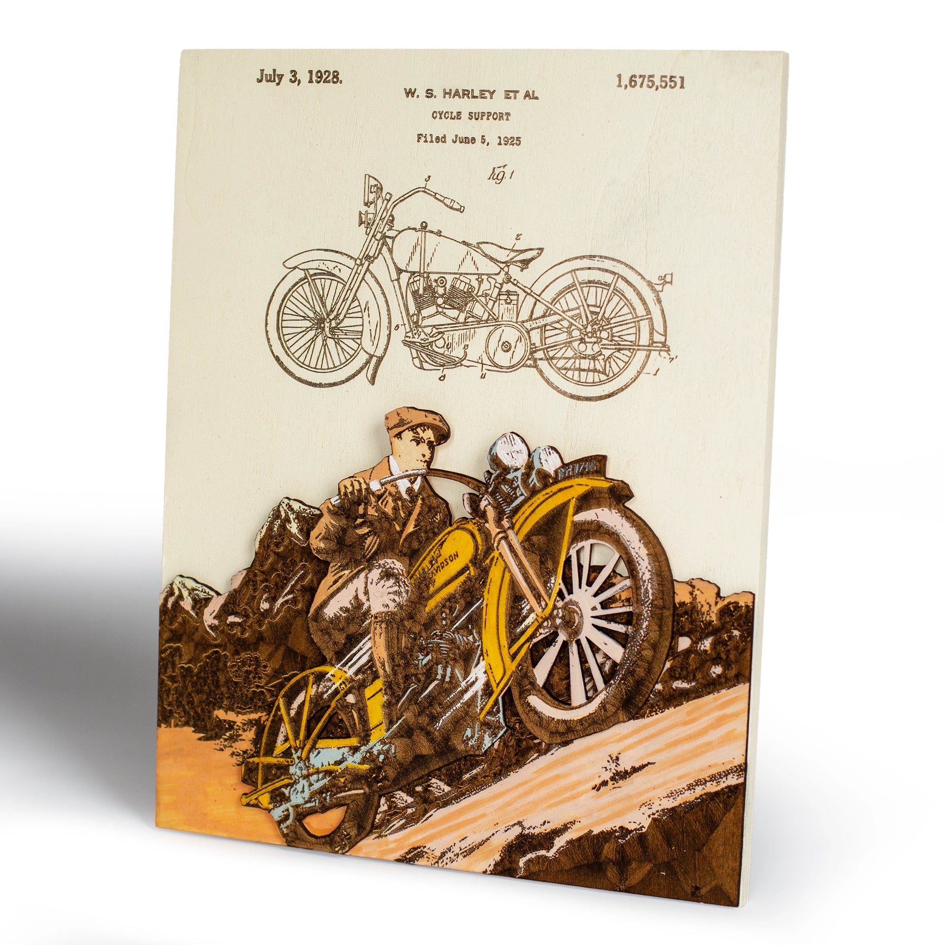 Each layer is laser-cut from premium wood and carefully assembled to highlight the texture of the motorcycle, the rugged landscape, and the intricate patent details. Perfect for Harley enthusiasts, bikers, and collectors, this piece captures the essence of the ride — freedom, tradition, and craftsmanship that stand the test of time.