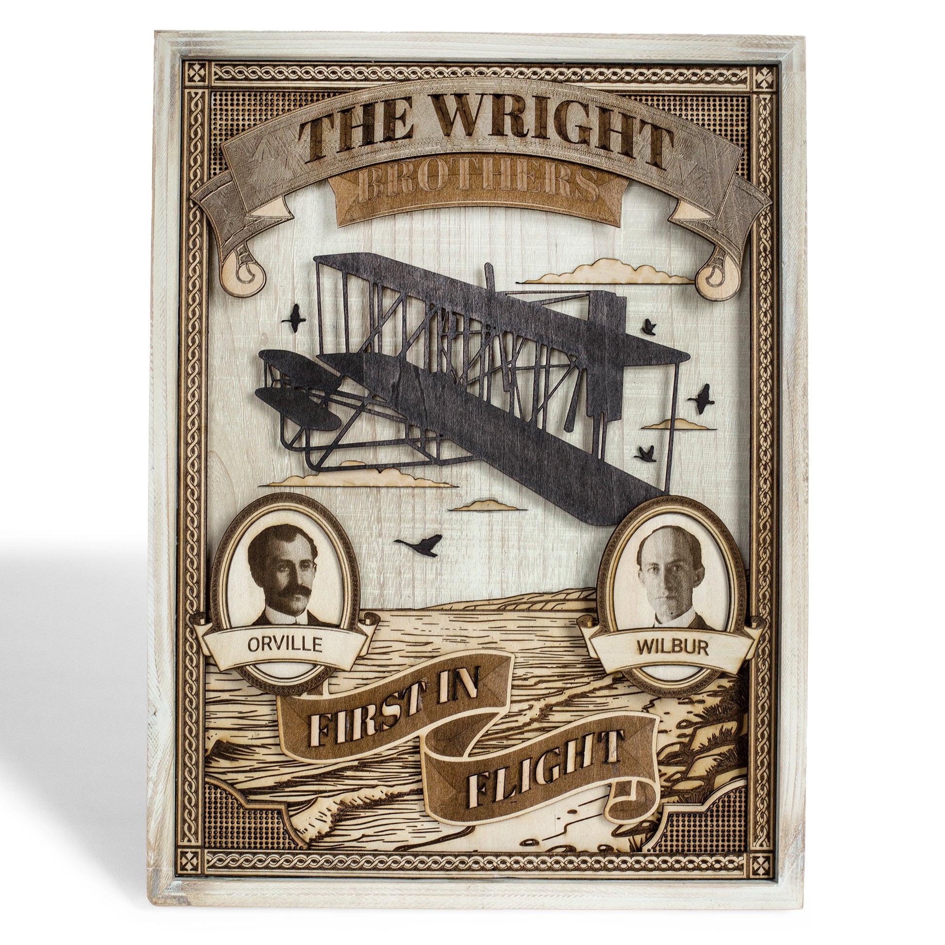 Celebrate the spirit of innovation and adventure with this stunning 3D wooden wall art honoring the Wright Brothers and their historic first flight in Kitty Hawk, North Carolina. This handcrafted piece beautifully captures the moment Orville and Wilbur Wright made aviation history — their pioneering aircraft soaring gracefully over the sandy dunes of the Carolina coast.